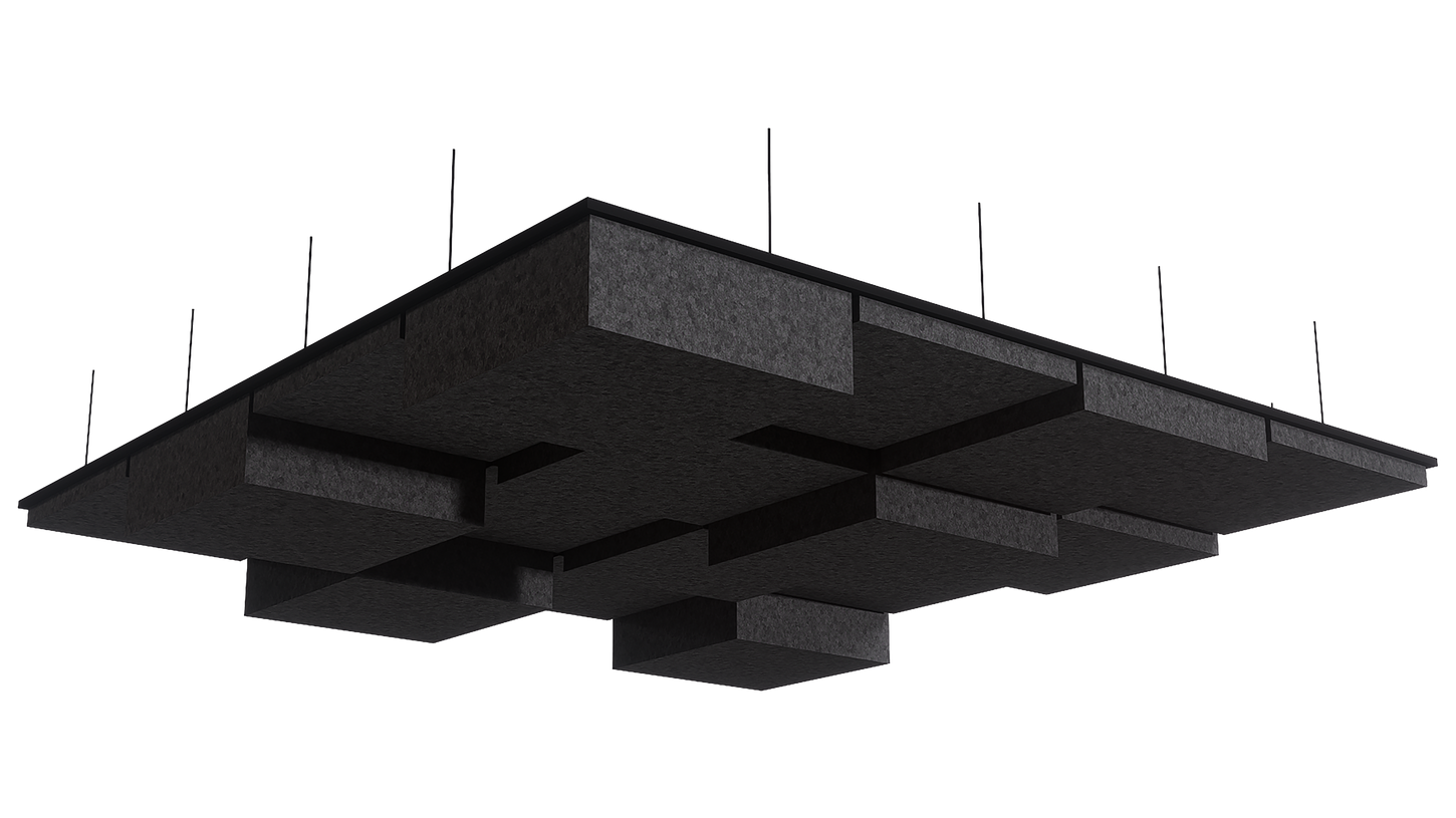 3D grid akustik paneller, tavanda üç boyutlu bir form oluşturarak sesi absorbe eden ve mekânın görsel derinliğini artıran yenilikçi akustik sistemlerdir. Keçe (PET felt) malzemeden üretilen bu modüler paneller, ses yansımalarını azaltırken mimari tavan tasarımlarına dinamik bir kimlik kazandırır.